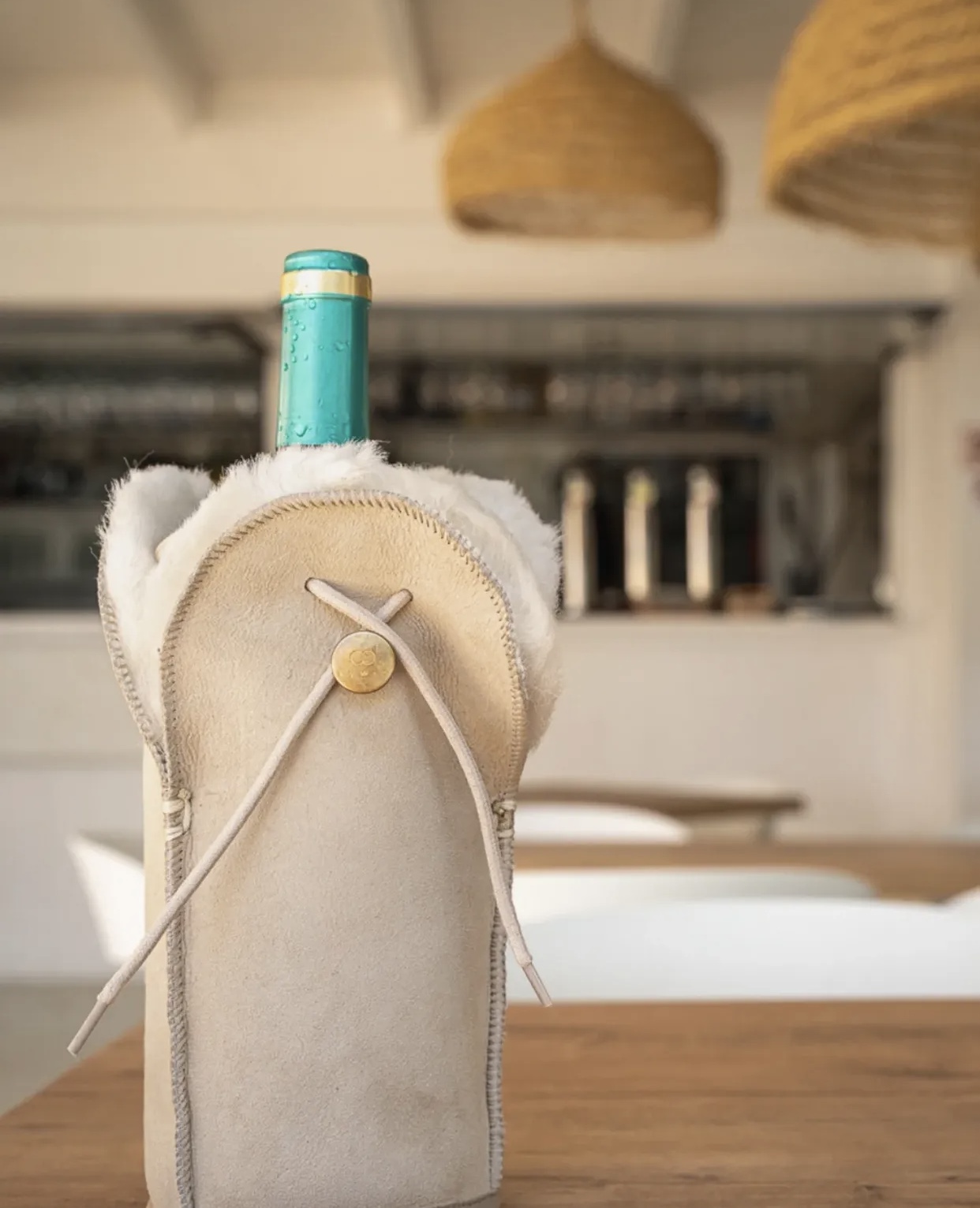 Deze champagnekoeler van het Nederlandse Kywie is van 100% schapenvacht. De uitzonderlijke wollen isolatie en het luchtsluiskoord houden uw voorgekoelde champagne, Bourgondië, mousserende wijn, cider en waterflessen 4 uur of meer op de gewenste temperatuur. Een uniek cadeau, een functionele blikvanger op elke tafel. Hij is handgemaakt in Europa van lokaal natuurlijk schapenvacht.